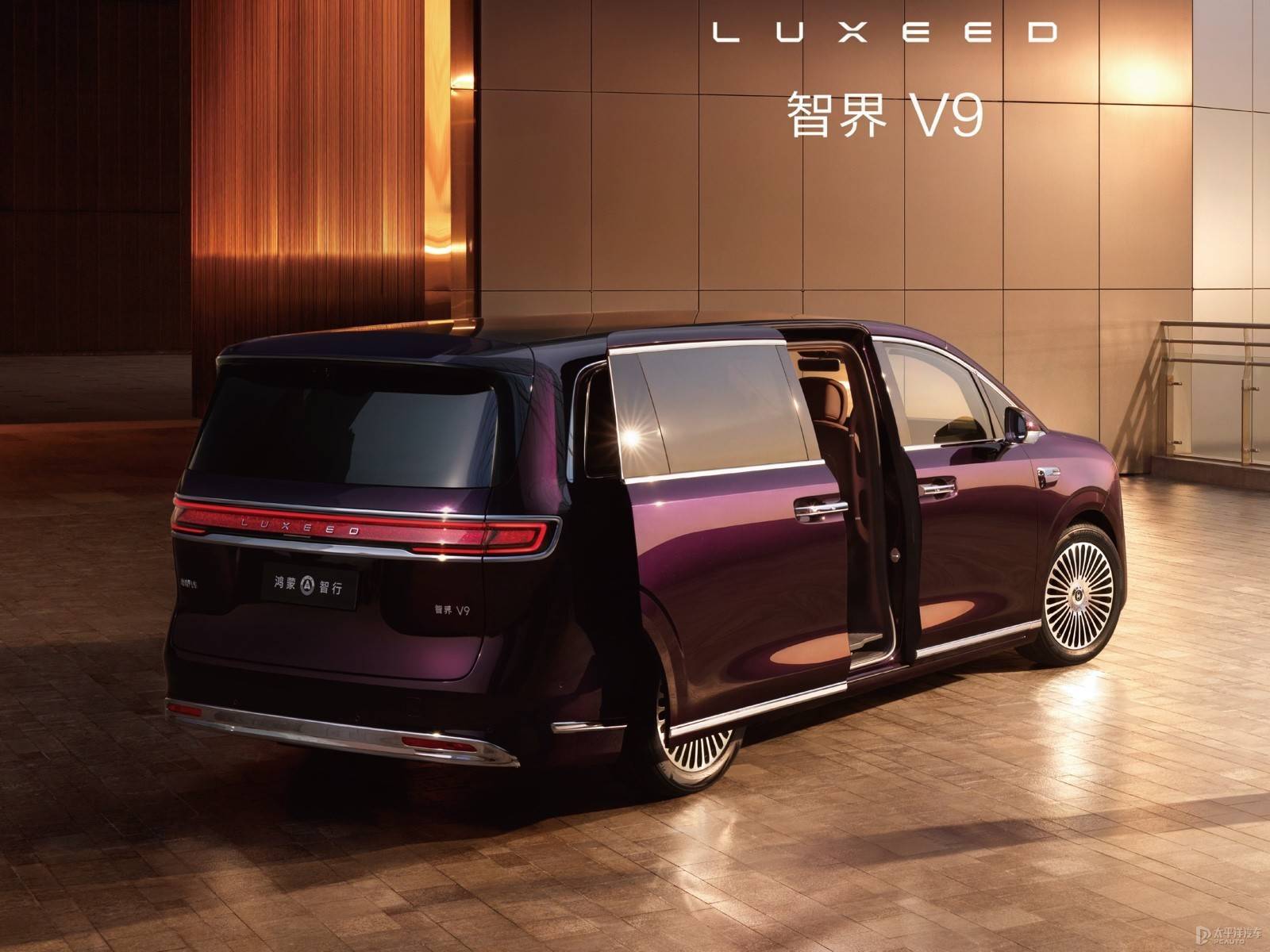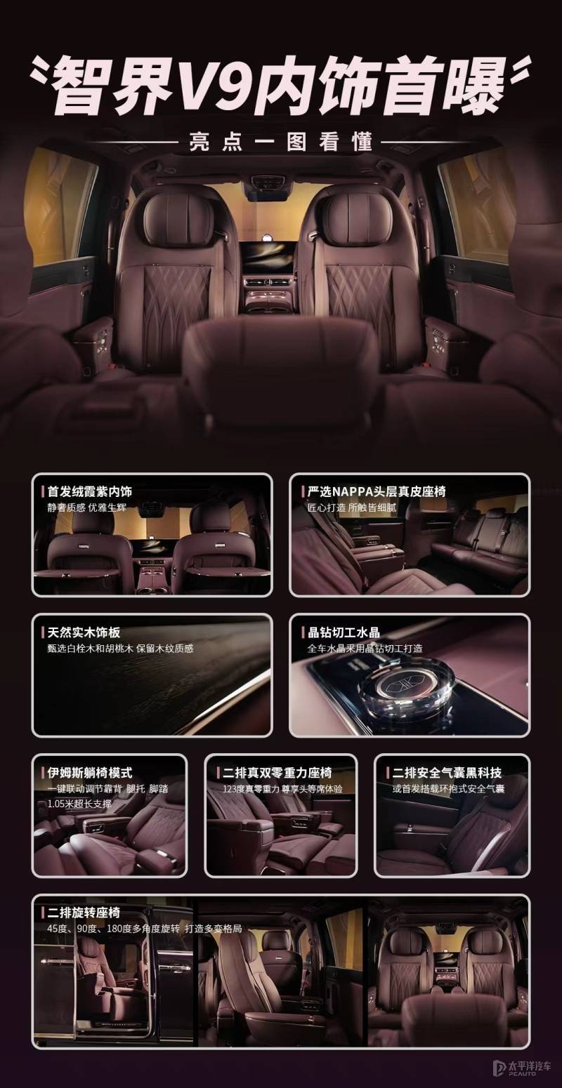 从发布的内饰官图来看,智界V9采用三联屏设计,风格与尊界S800相似,配备了绒霞紫内饰配色,且用料极为考究,包括采用NAPPA头层真皮座椅、天然实木饰板、晶钻切工水晶的旋钮等高端材质。