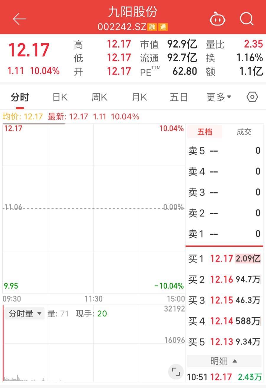 11月14日,九阳股份(002242.SZ)再现强势涨停行情。截至当日10时51分,该股报12.17元/股,封板金额高达2.09亿元道正网配资,成功走出2连板走势。不过,这场股价异动或源于一款与公司无关的网红豆浆饮品。